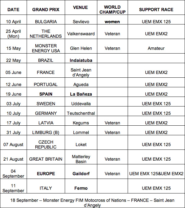 (Including FIM Veterans’ World Cup, Monster Energy FIM Motocross of Nations, UEM EMX 125 European Championship, UEM EMX2 European Championship)